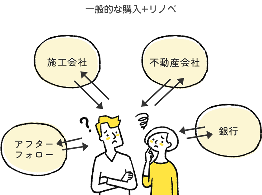 物件探しは不動産会社へ、リノベはリフォーム会社に依頼するのが一般的ですが、窓口が複数になり、お客様の負担も増えがちです。