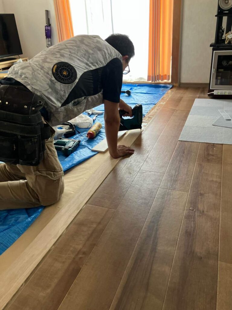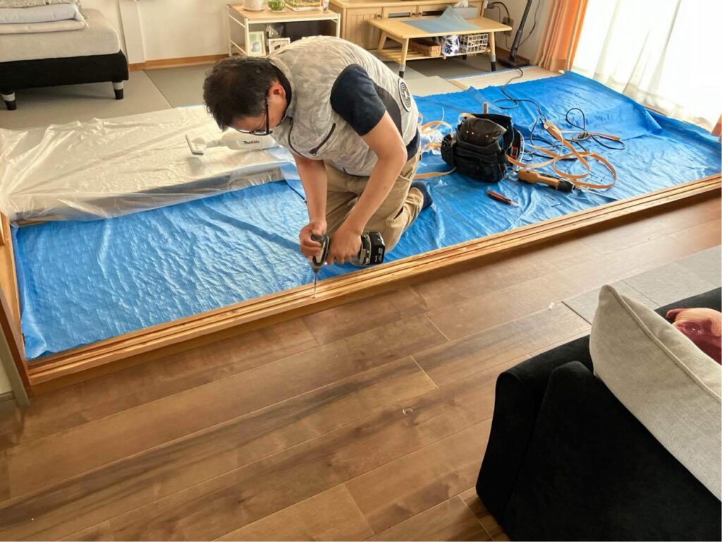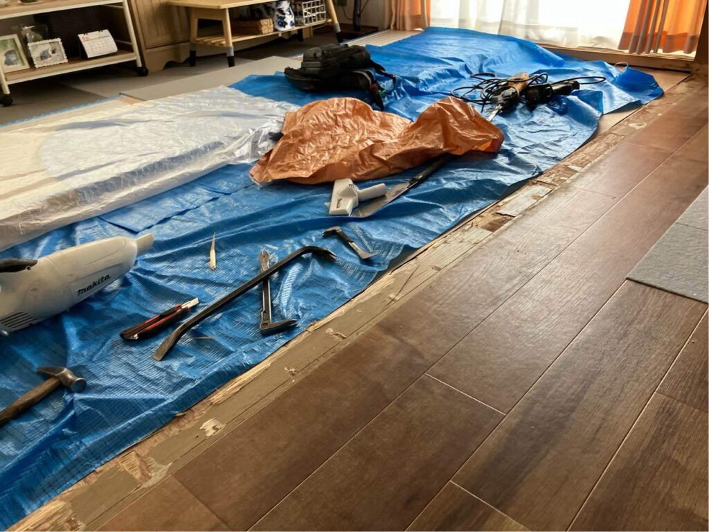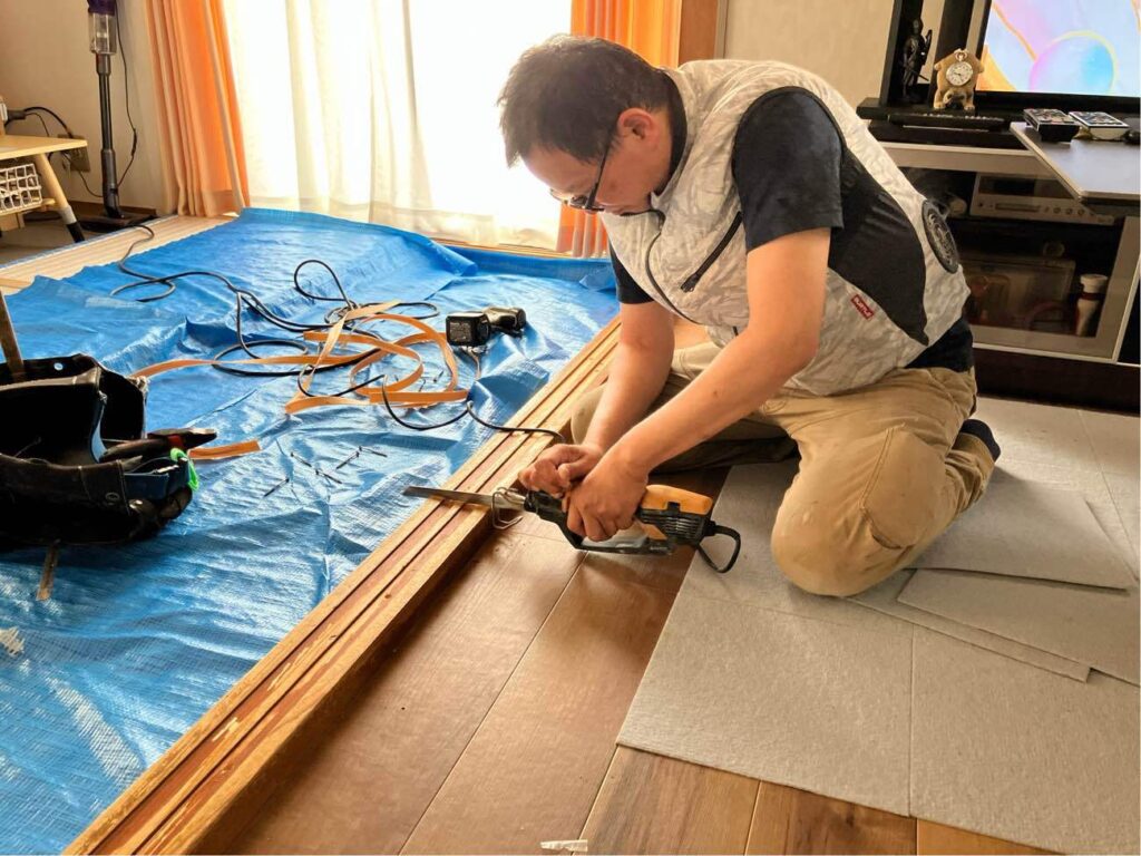 まず敷居を解体します。リビングの床は既存のままなので慎重に作業します。
