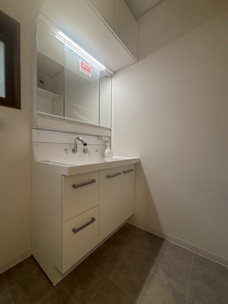 新しく取り付けた洗面化粧台は、LIXILの「ピアラ」 幅900 スマートポケット付三面鏡・アッパーキャビネット付