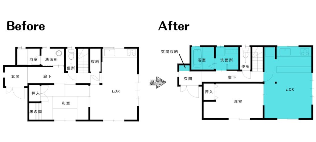 LDKに収納部分を取り入れ少し拡張し、洗面所と浴室部分は、廊下側に拡張しました。