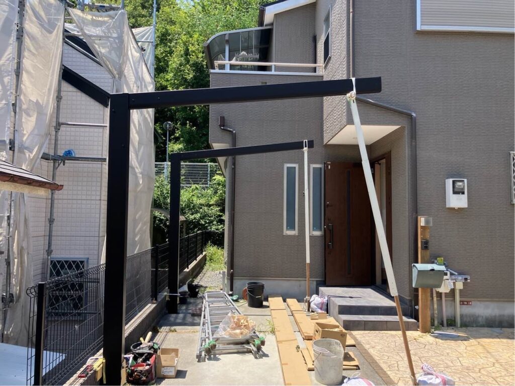 新しいカーポートはYKKAP/エフルージュFIRSTシリーズで屋根材は遮光ポリカーボネートのブラック色になります。