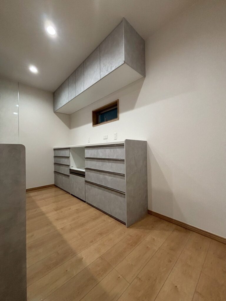 同じ大きさのキッチン交換とキッチンと同じシリーズのカップボードを設置します。