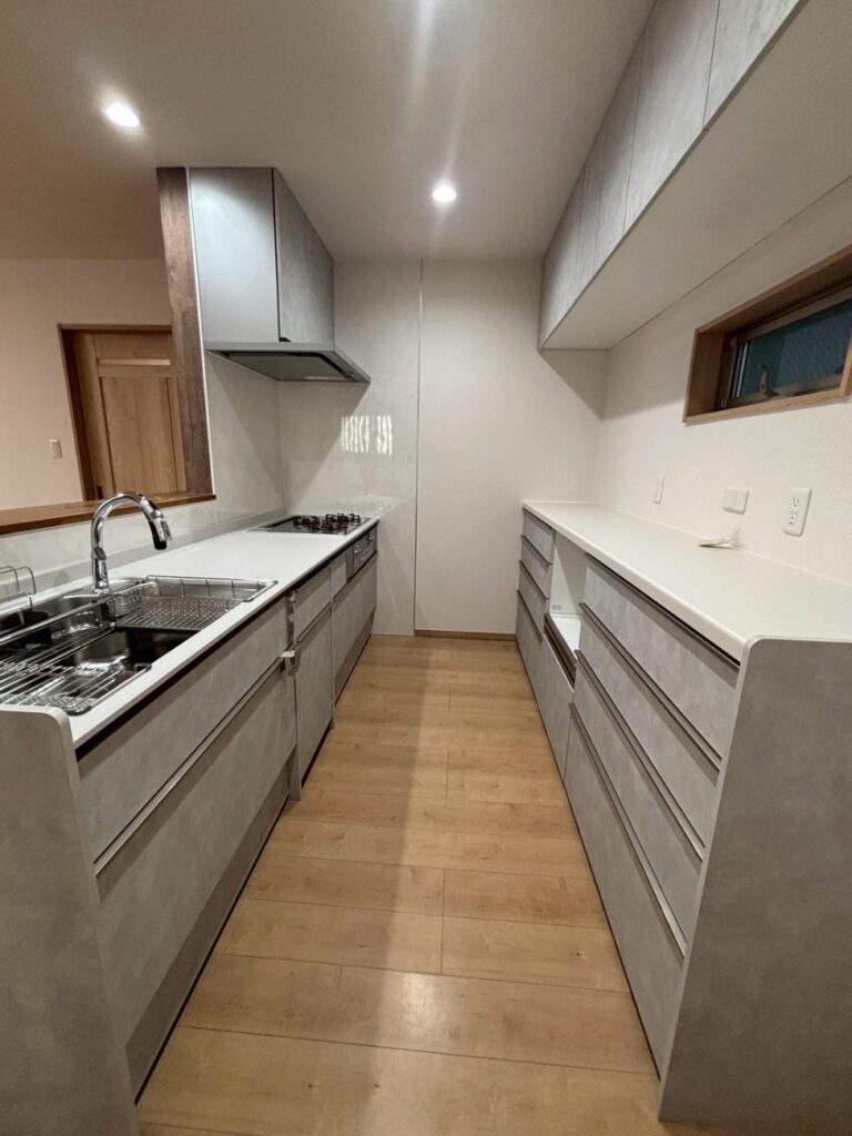 新しいキッチンはLIXILのノクトI型2550 扉柄:ホワイトスタッコ カウンター:人造大理石シルフィーグレー