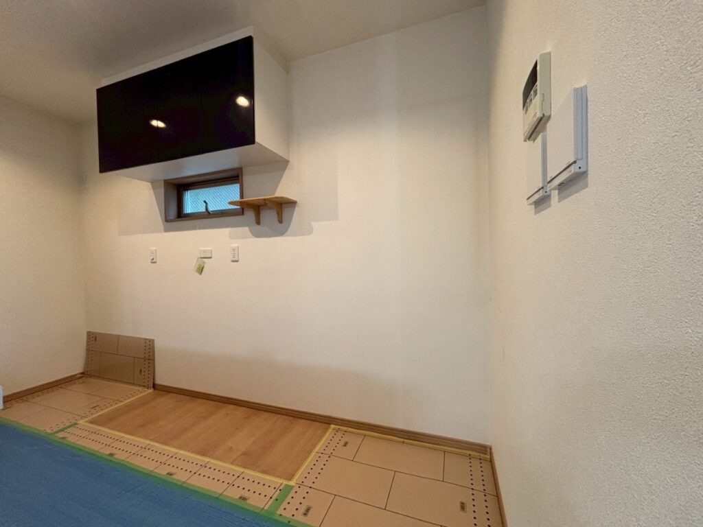 写真は既存のキッチンを撤去し、給水・排水・電気配線を移設した様子になります。