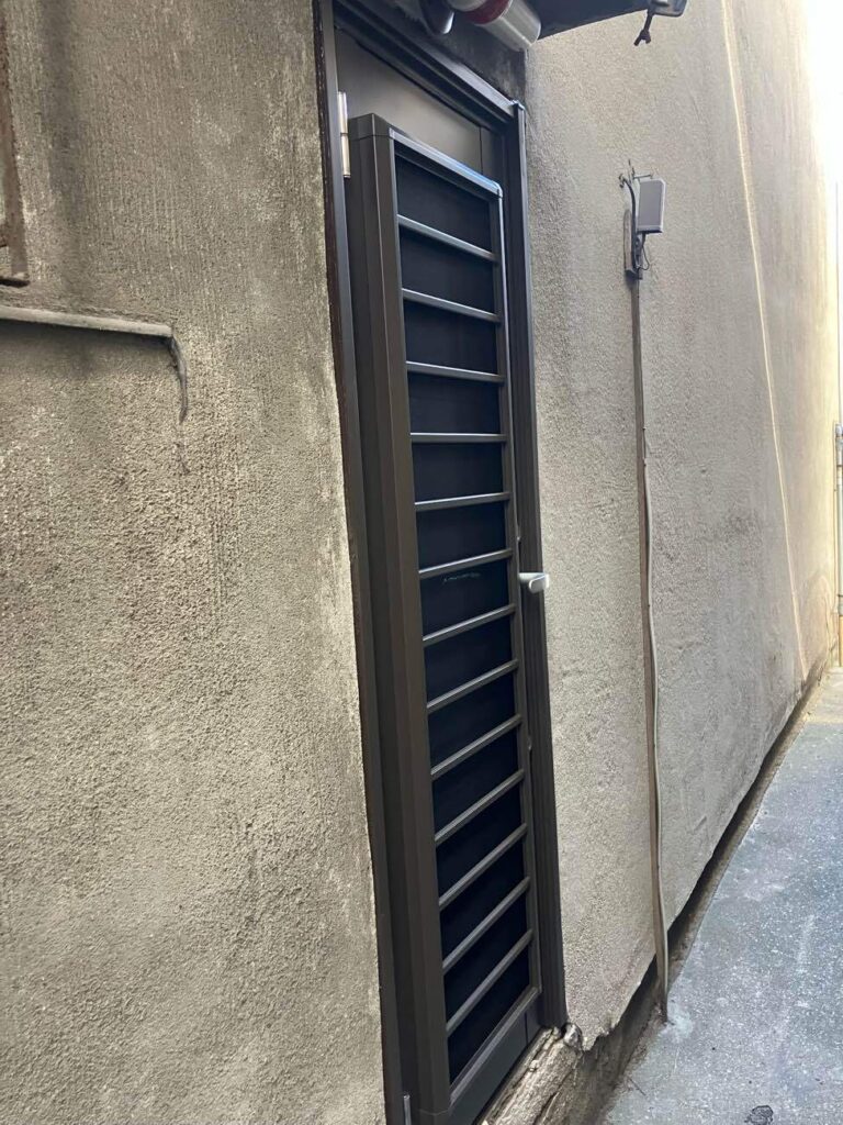 腐食や防犯上危険性が高いのでアルミ製の勝手口に交換させて頂きました。