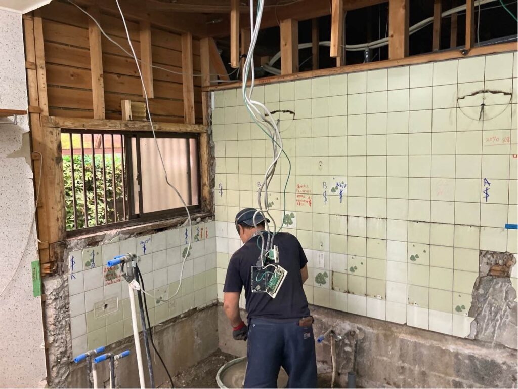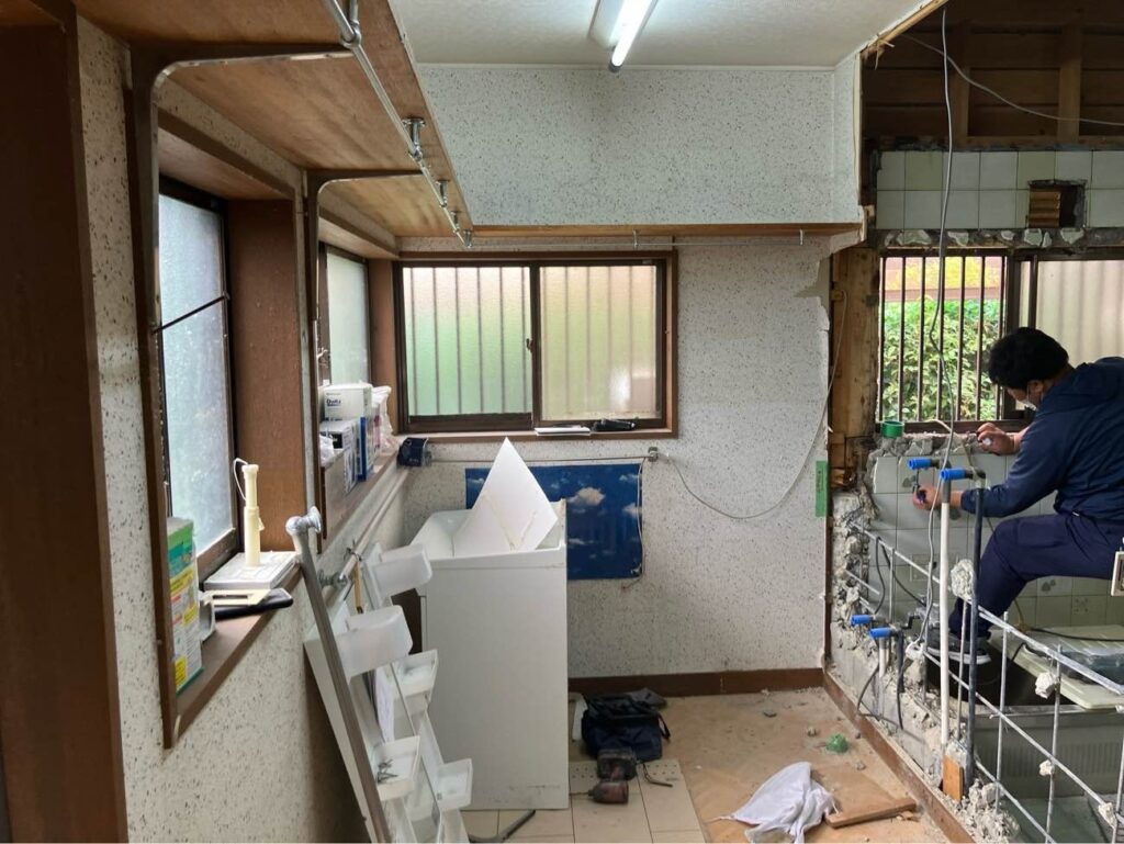浴室が広がり、浴室と洗面所の壁の位置が変わりますので新たな壁の位置まで解体しています。