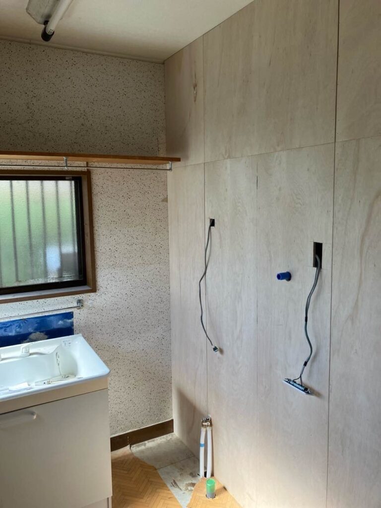 写真の壁は浴室と洗面所の新たに造作した間仕切り壁になります。