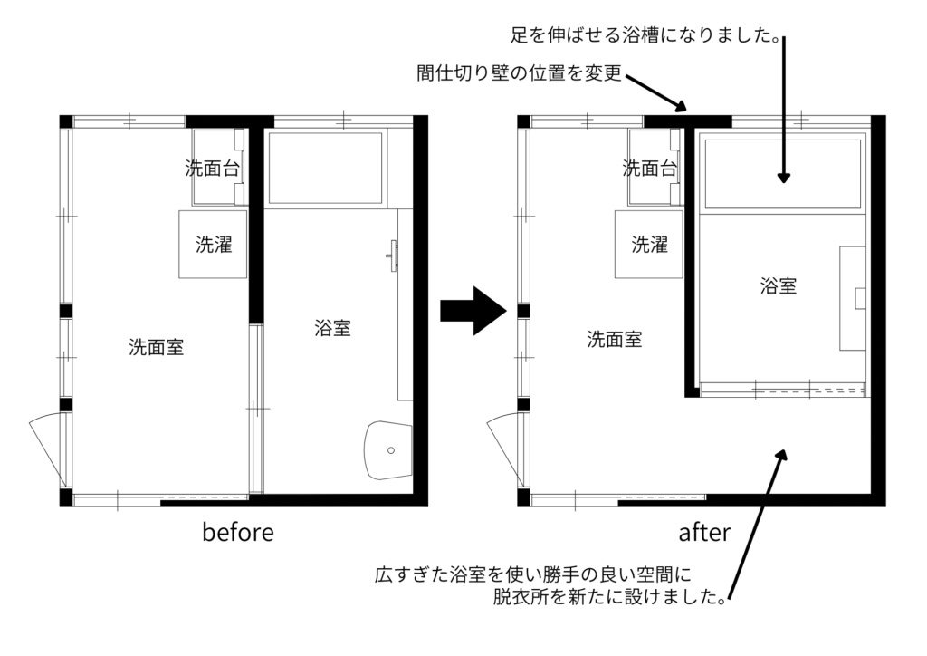 ユニットバスにすることで以前より浴室空間が狭くなるので余ったところは脱衣場にしていきます。