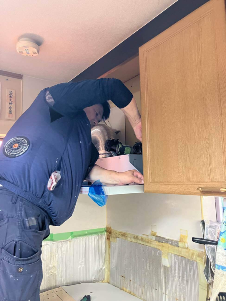 ピタッと既存キッチンに合わせて作業時間2時間程度でレンジフードを取り付けて行きます。