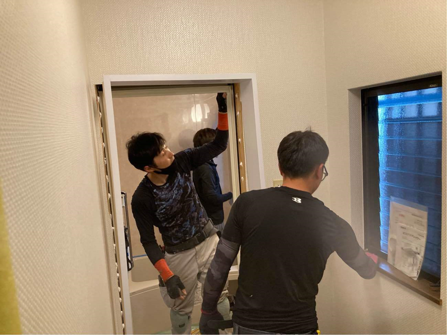 写真はその出入り枠の取り付け作業の様子です。