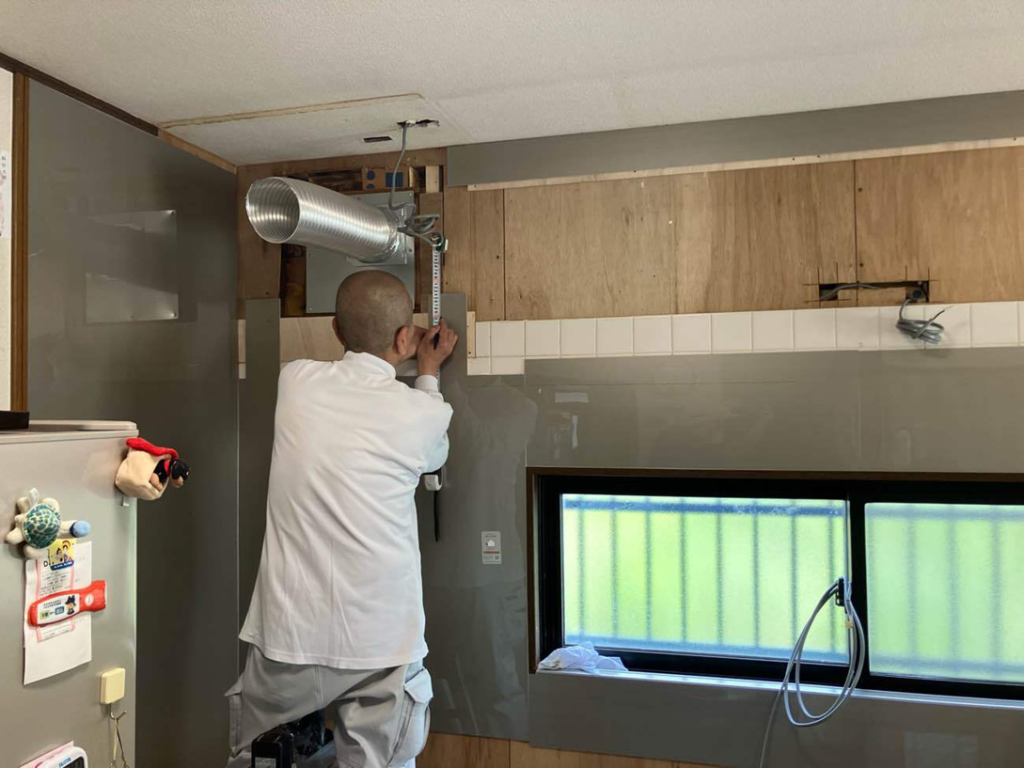 なお、写真は、新しいレンジフードの取り付け位置を確認しているところです。