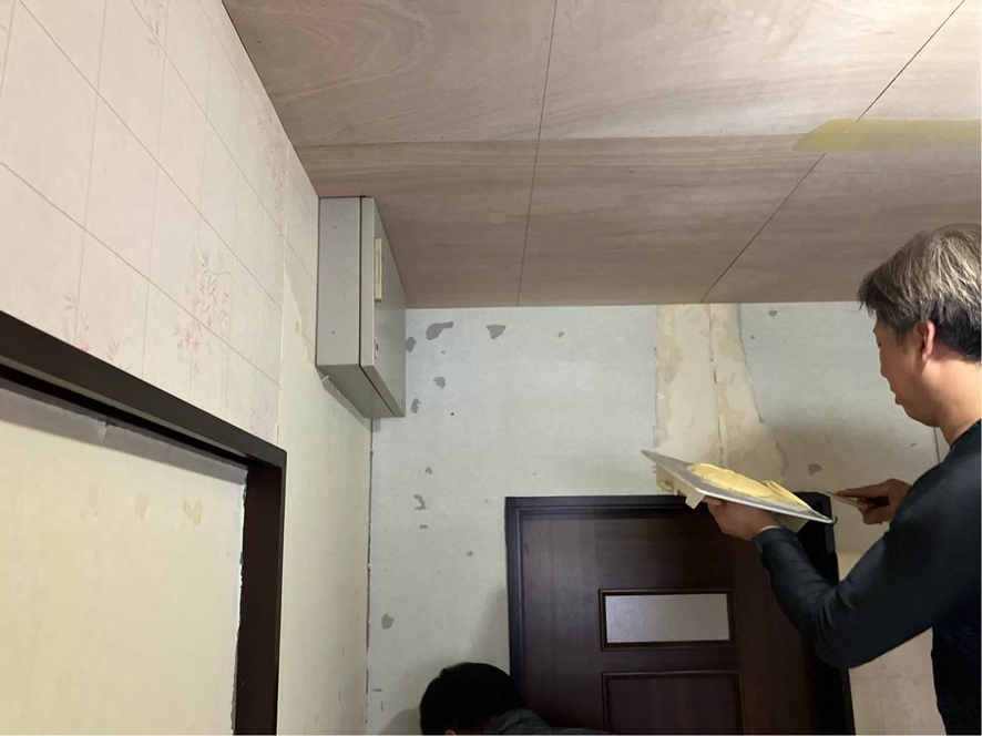 クロスの貼替は既存のクロスを剥がす→下地処理(パテ)→新しいクロス貼りの手順で進みます。