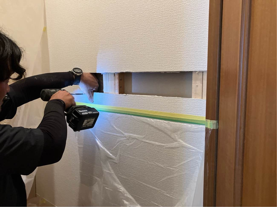 写真はトイレの壁で手すり取り付ける位置に壁補強の下地を入れている様子です。