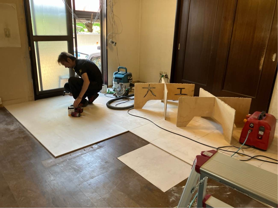 今回はコンクリート造のお家で現状の床がスラブ直貼りだったため床材がペコペコしている箇所がありました。