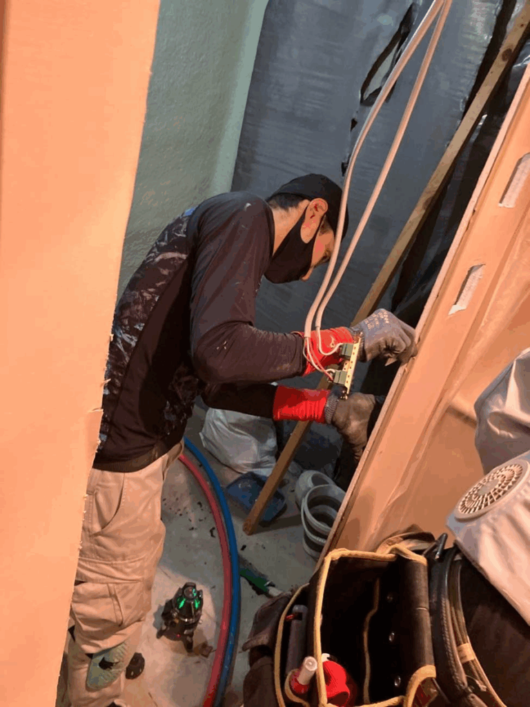 写真は既存のユニットバスを解体したあと電気屋さんが配線の仕込みをしています。