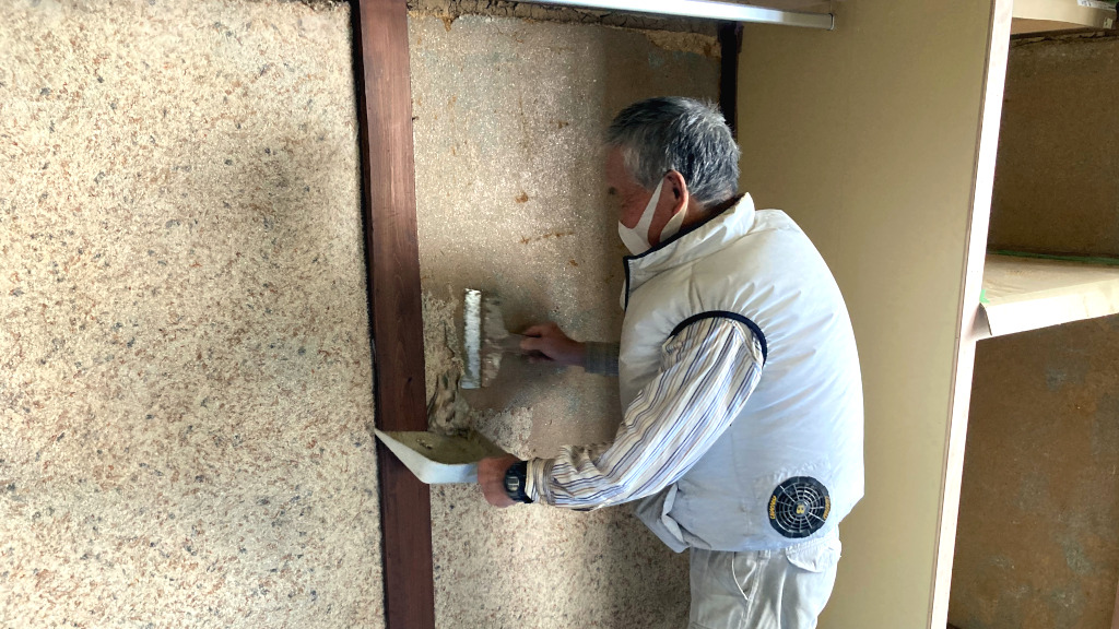 和室改装工事において、既設綿壁の撤去作業中です。(担当:植田)