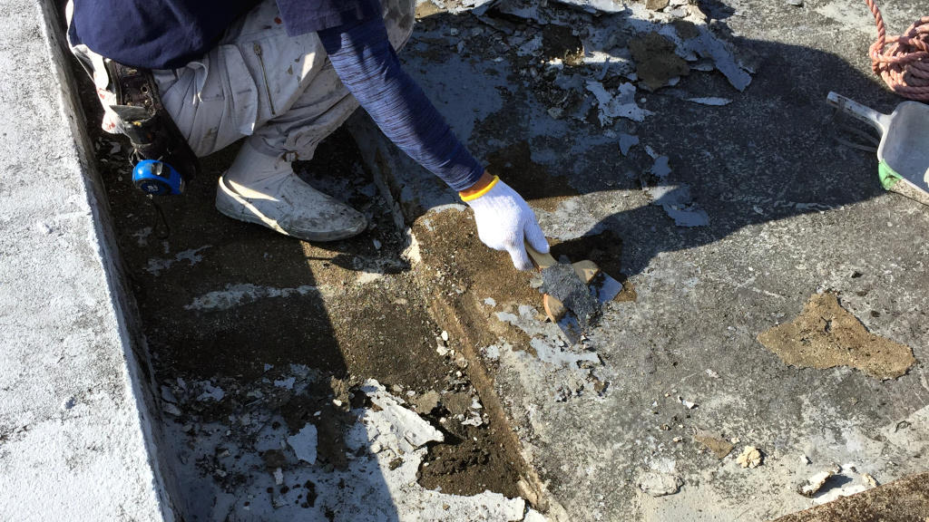 防水工事において、既設防水膜の剥離作業中です。(担当:近藤)
