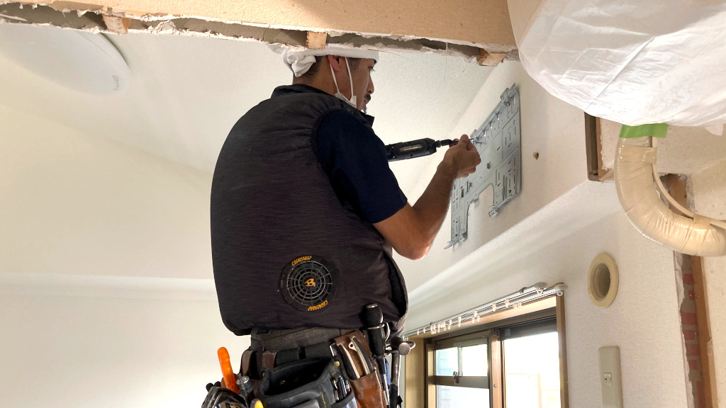 エアコン取付工事にて、壁面にエアコンのバックハンガーの取付作業中です。(担当:古河)