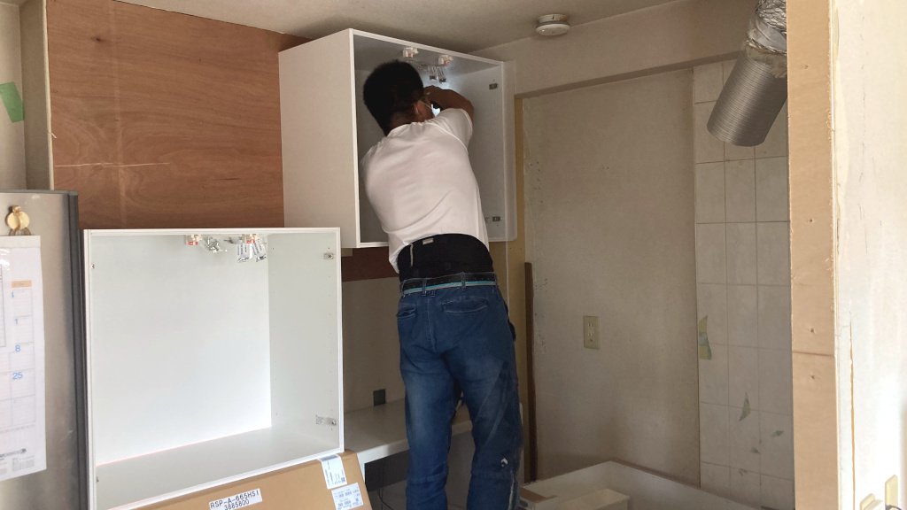 カップボード取付工事です。吊戸棚の組付け作業中です。(担当:木伏)