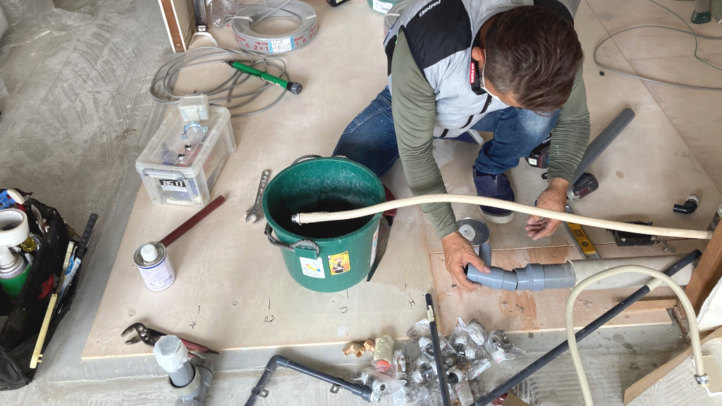キッチン取替工事において、背面にカウンターの無いキッチンを設置する為、配管位置を移設変更作業中です。。(担当:古河)