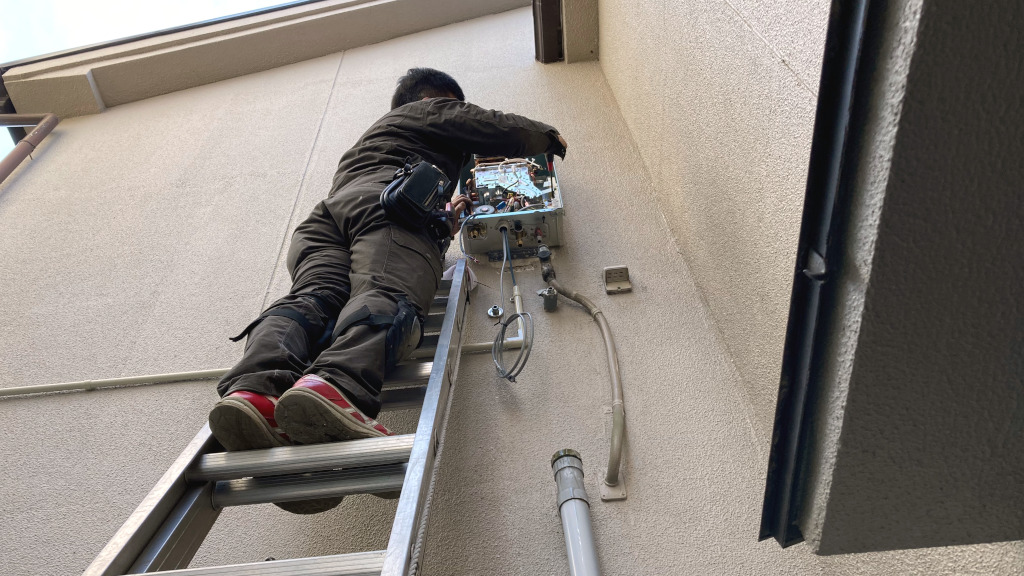 給湯器取替工事です。高所作業での取替です。(担当:山﨑)
