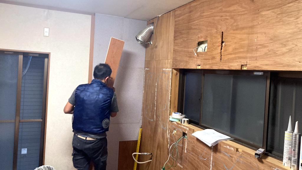 キッチン取替工事中です。キッチン取付前の下地調整作業中です。(担当:松本)