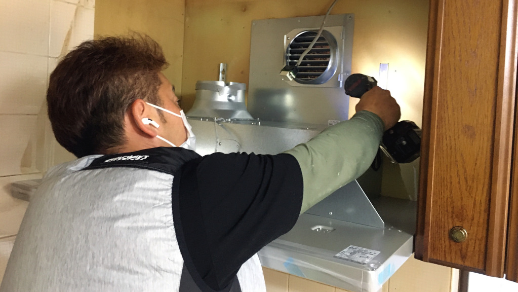 レンジフード取替工事です。レンジフードを壁面へ固定作業中です。(担当:森山)