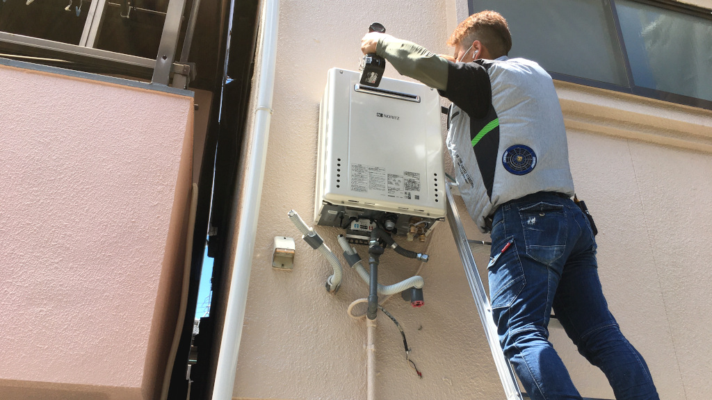給湯器取替工中です。新しい給湯器の吊掛け作業中です。(担当:森山)