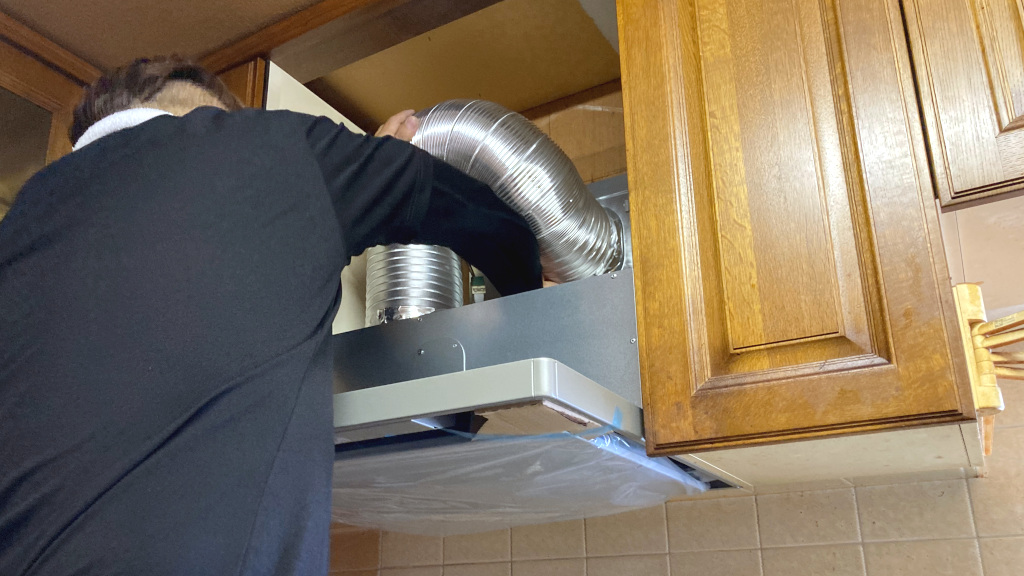 レンジフード取替工事中です。排気用アルミダクトの接続作業中です。(担当:中野)