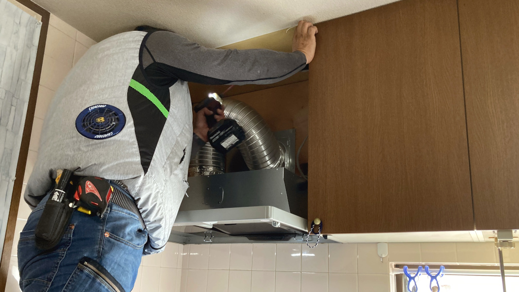 リフォーム現場 東大阪市 レンジフード取替工事中
