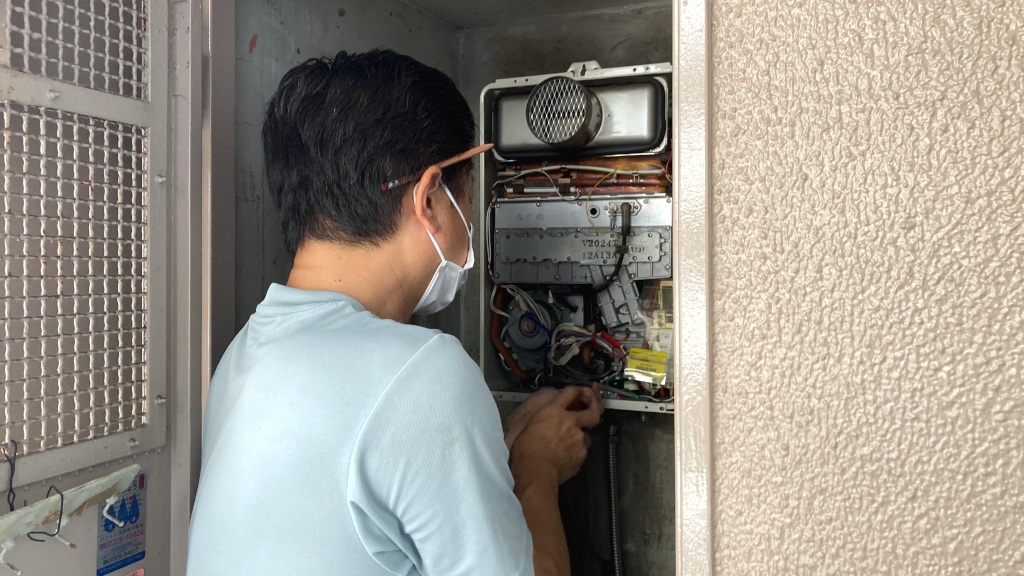 マンションで給湯器取替工事中です。リモコン配線を接続作業中です。(担当:緒方)
