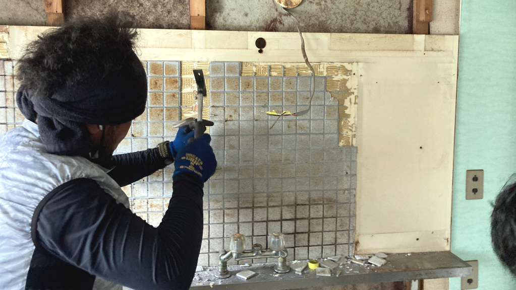 キッチン取替工事です。既設キッチン解体撤去において、キッチン前のタイルを剥離作業中です。(担当:濵田)
