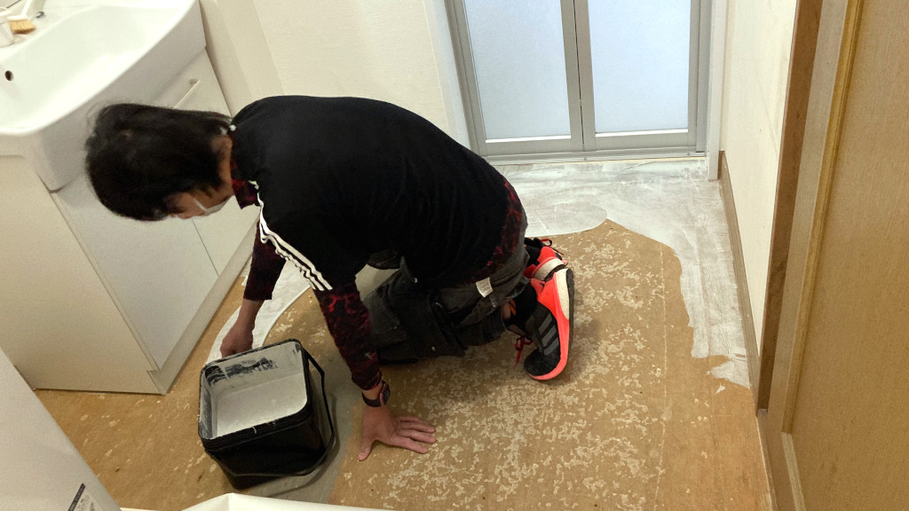 洗面室のクッションフロア貼替工事です。ボンド塗布作業中です。(担当:奥村)