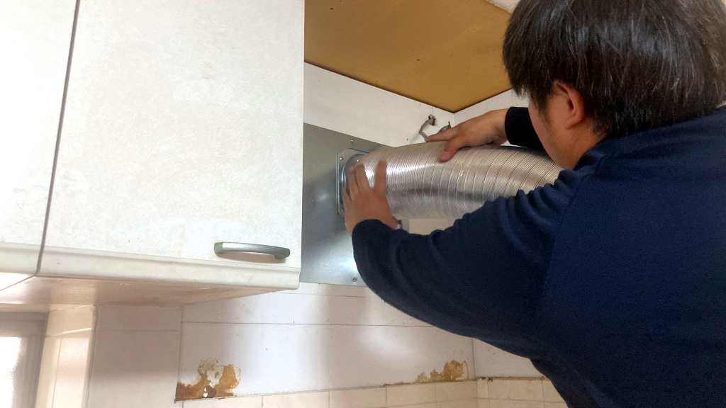 レンジフード取替工事中です。アルミダクト取付作業中です。(担当:岡田)