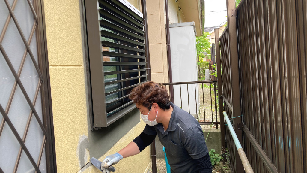 外部サッシ取替工事において、サッシ廻りのモルタル左官作業中です。(担当:奥村)