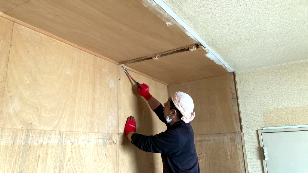 押入解体撤去工事中です。押入れ解体後、部屋の一部とする為、必要のない木材を撤去しています。(担当:古河)