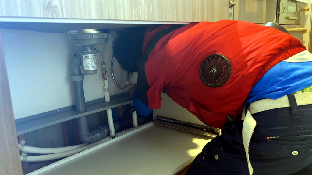 キッチン取替工事です。キッチン組付け後の給水・給湯配管の接続作業中です。(担当:松本)