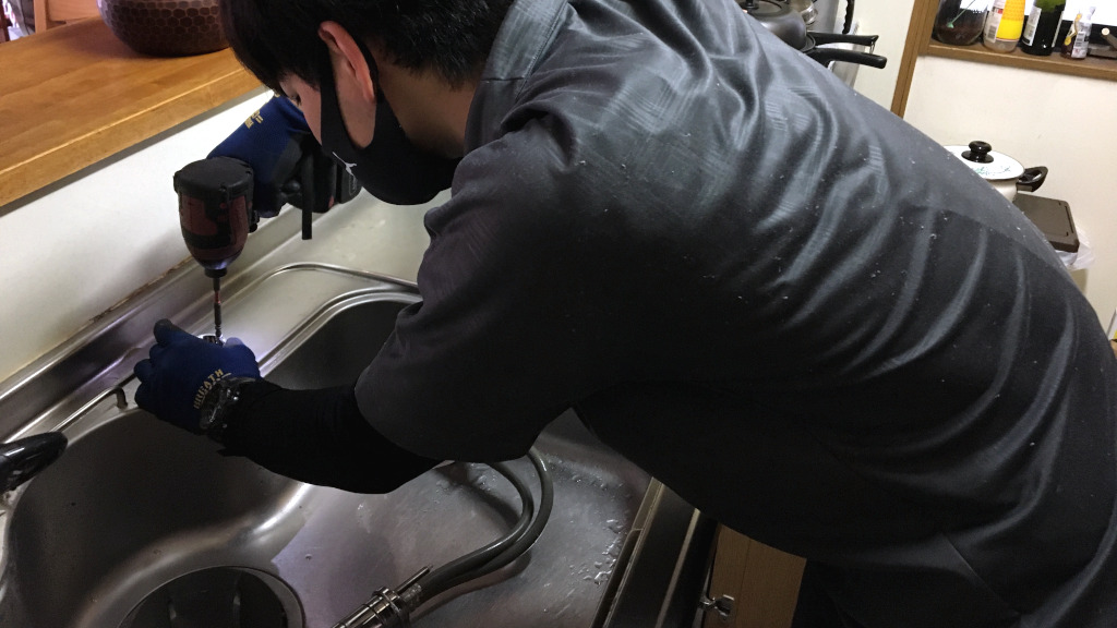 リフォーム現場 高槻市 キッチン水栓取替工事中