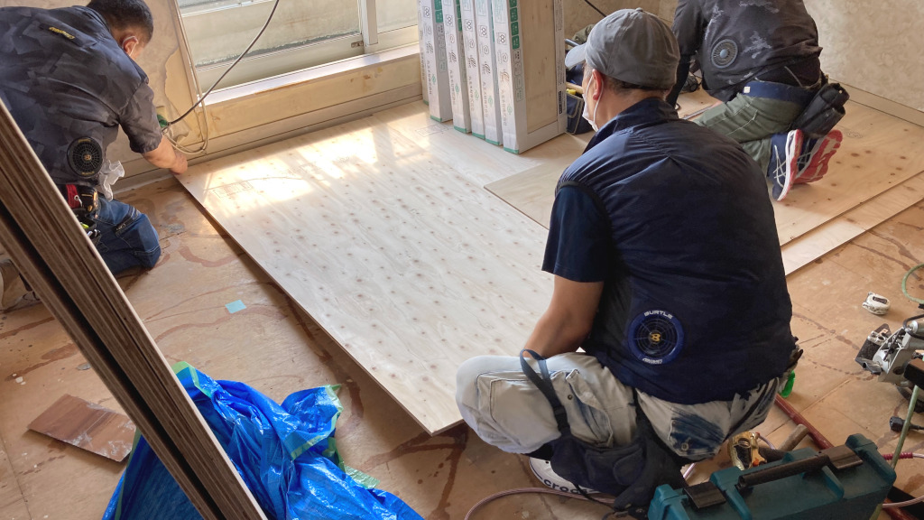 フローリング貼替工事です。既設下地の上に更に下地を増し貼り作業中です。(担当:名嶋)
