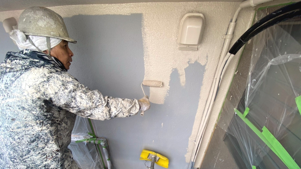 外壁塗装(DANシリコンセラR)中塗り工程中です。(担当:木谷)