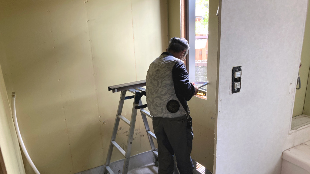 浴室取替工事において、浴室外窓の取替工中です。(担当:前原)