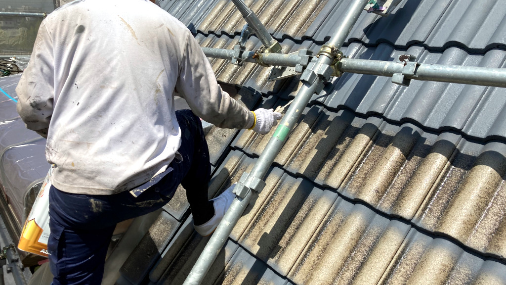 屋根塗装工事にて急勾配の為、屋根足場を組みSUN瓦Xトップ塗料でエクセルガード塗布作業中です。(担当:木谷)