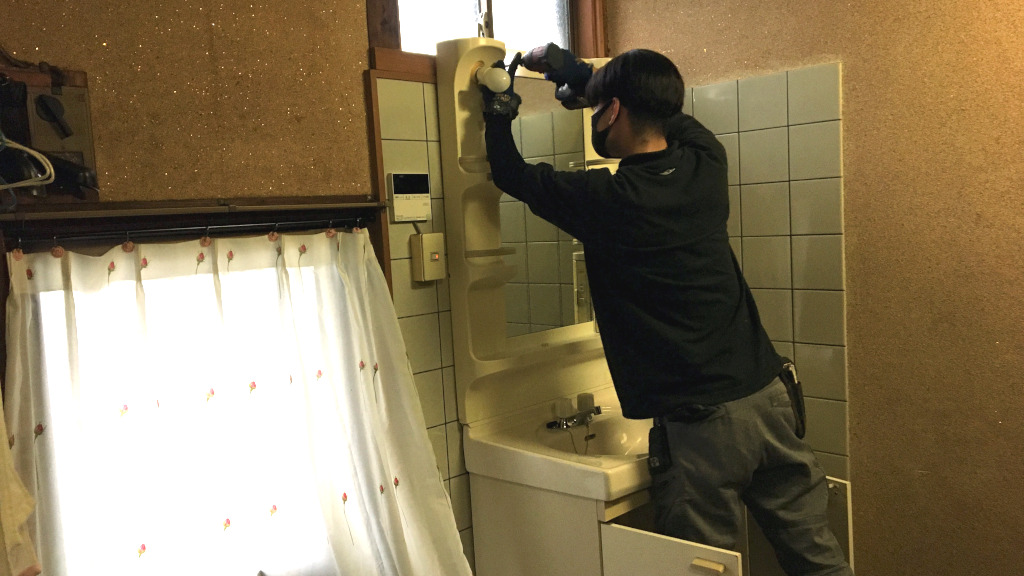 洗面化粧台の取替工事です。既設洗面台の解体撤去作業中です。(担当:田中)