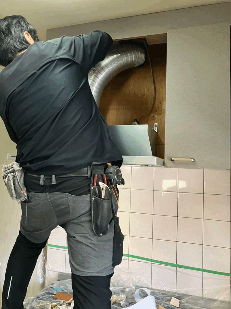 ピタッと既存キッチンに合わせて作業時間2時間程度でレンジフードを取り付けて行きます。