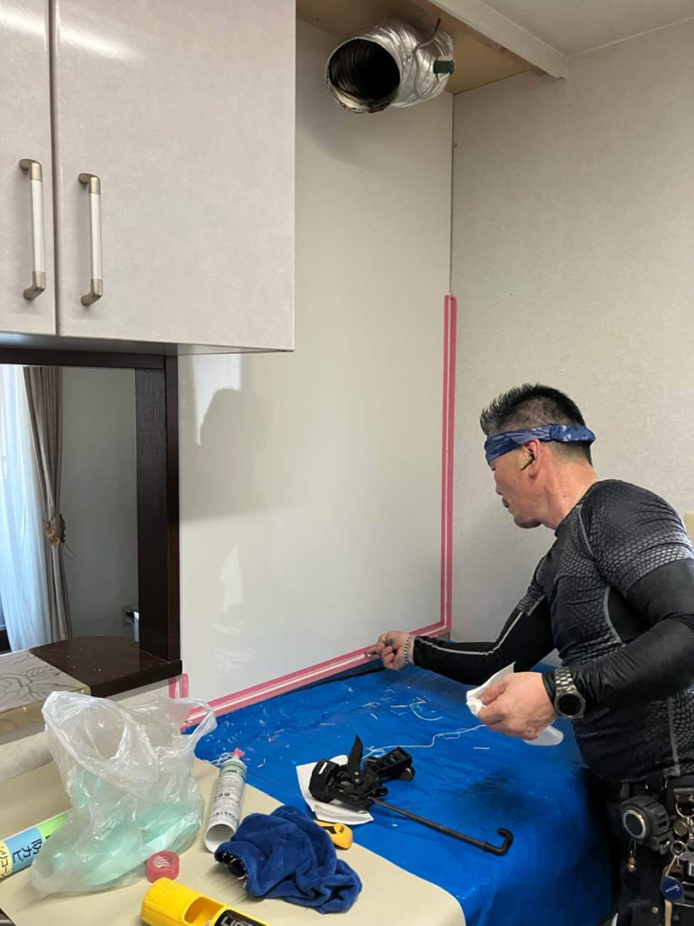 キッチンパネルを貼り替えて継ぎ目にコーキングを打っています。
