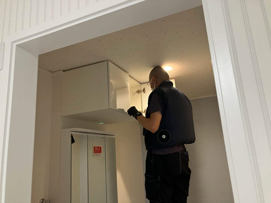 写真は、完成した洗面所の上に吊戸棚を設置し、使いやすさをさらにアップしているところです