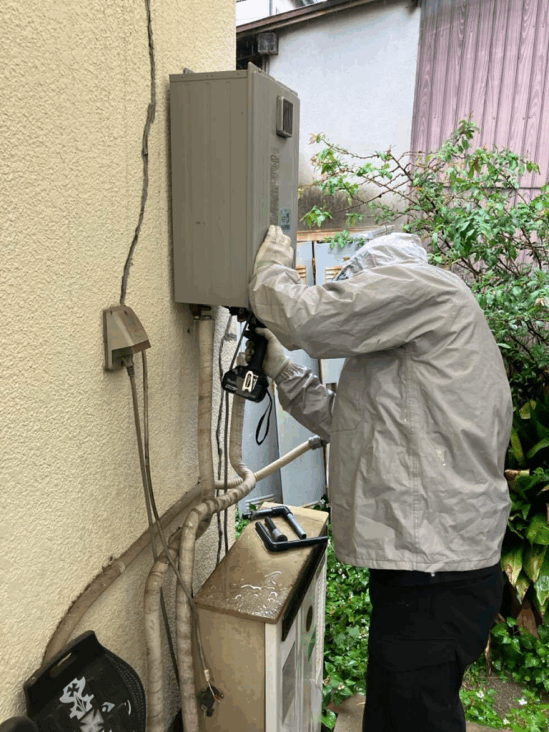 写真は、既存の給湯器を撤去しているところです。
