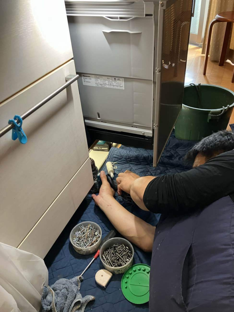 写真は新しい食洗機を取り付け、給排水の接続を行っている様子です。