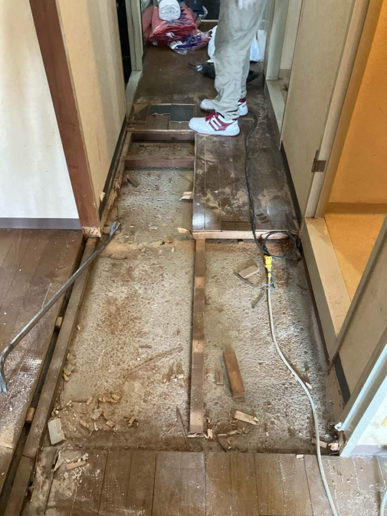 万協フロアーで床を上げ、断熱材を入れ、パーティクルボードを敷き、床材を仕上げていきます。