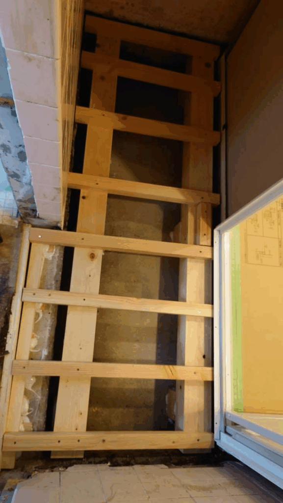 壁に下地を捨て張りしてクロスを貼れるようにするのでタイルは残したままで壁を造作して進めます。